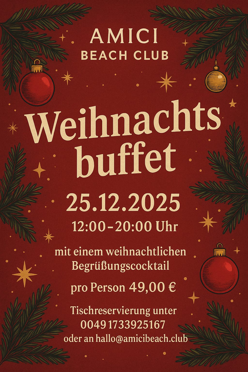 Festliches Weinachtsbuffet 25.12.2025 von 12 Uhr bis 20 Uhr. Mit einem weihnachtlichen Begrüßungscocktail. Preis pro Person: 49€ Tischreservierung unter tel: 0173 3925167